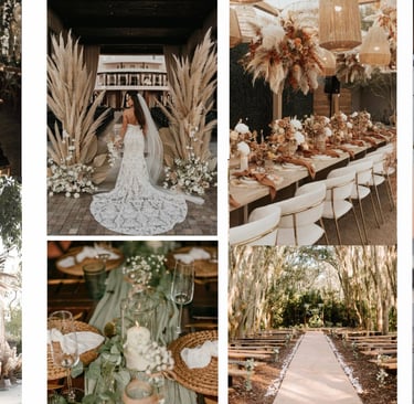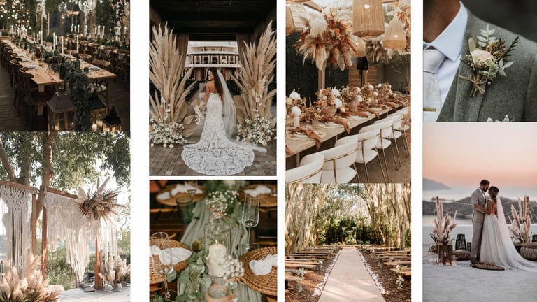 Bohemiškos vestuvės - įkvėptos gamtos ir natūralumo, geriausiai šią stilistiką galima išpildyti kruopščiai suplanuotu dekoru. Natūralu, jog tokia stilistika reikalauja gamtai artimos vietovės: miško, seno dvaro, sodybos, rustic stilistikos terasos. Žali, rusvi, balkšvi atsvaliai dominuoja ne tik dekore, bet taip pat ir jaunųjų įvaizdyje, dažnai akcentu pasirenkamas senovinis automobilis.